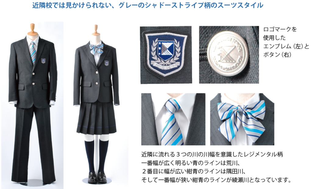 リサーチで得られた情報や、策定したオリジナルカラー・ロゴといったブランドコンセプトは、生徒が日々着用する制服デザインに反映されました。近隣校の多くが紺のブレザーを採用していることを踏まえ、グレーのシャドーストライプ柄のスーツスタイルとすることで、他校との差別化を実現。また、オリジナルカラーである「紺青」を基調にしたエンブレムを採用し、ネクタイやリボンには、近隣を流れる3つの川を表現するデザインを取り入れました。