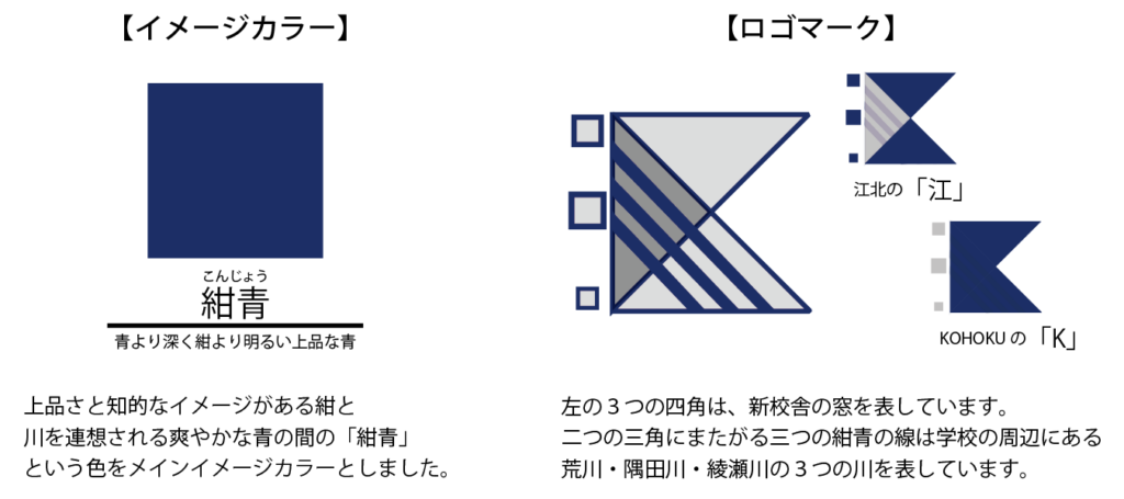 リサーチ結果をもとに、イメージカラーとロゴマークを策定しました。メインカラーには、上品さと知的なイメージがある紺と川を連想される爽やかな青の間の「紺青」という色をオリジナルのイメージカラーとして策定。ロゴマークは、新校舎の特徴である四角い窓や、学校の周辺を流れる3つの川、そして「江北」の「江」と「KOHOKU」の「K」をモチーフにデザインしました。